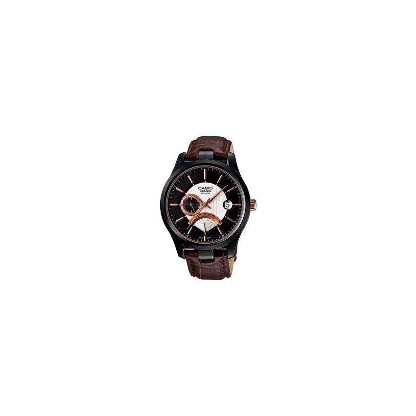 Casio BEM-308BL-1AV e моден мъжки часовник от серията BESIDEКорпусът е изработен от оксидирана черна стомана, каишката е направена от кафява естествена кожа , черно-бял циферблат Casio BEM-308BL-1AV е с луминесцентно покритие, осигуряващо продължително осветяване на тъмно дори и след кратко излагане на светлина Минерално стъкло, устойчиво към надраскване Има винт на задния капак на часовника, който предпазва от неволно отваряне Показва 24 часовия диапазон Има двойно време - показва часа в два различни часови пояса Показва дата от месеца Водоустойчивост 5 бара - позволява къпане и миене /без плуване или гмуркане/ Работи с точност: ± 20 секунди на месец Доставката и на този страхотен модел е безплатна за цяла България с право на преглед преди да го заплатите