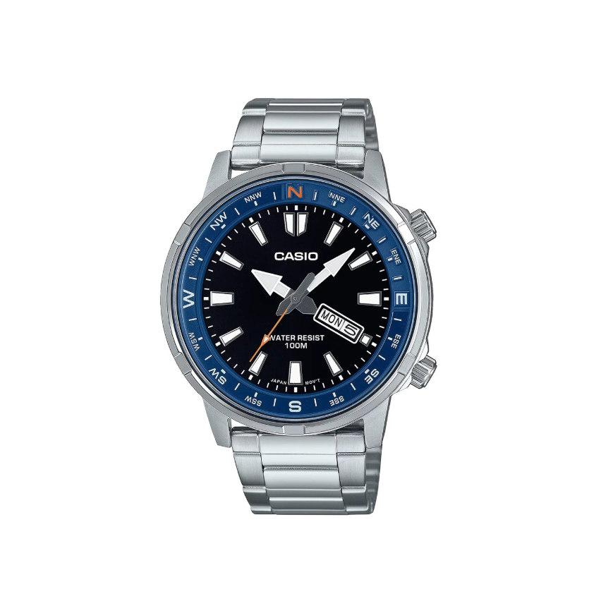 - Дисплеят е аналогов в черен цвят с класически дизайн и син външен ринг, показатели за ден от седмицата и месеца на 4 часа, както и лумeнисцентни стрелки и индекси.