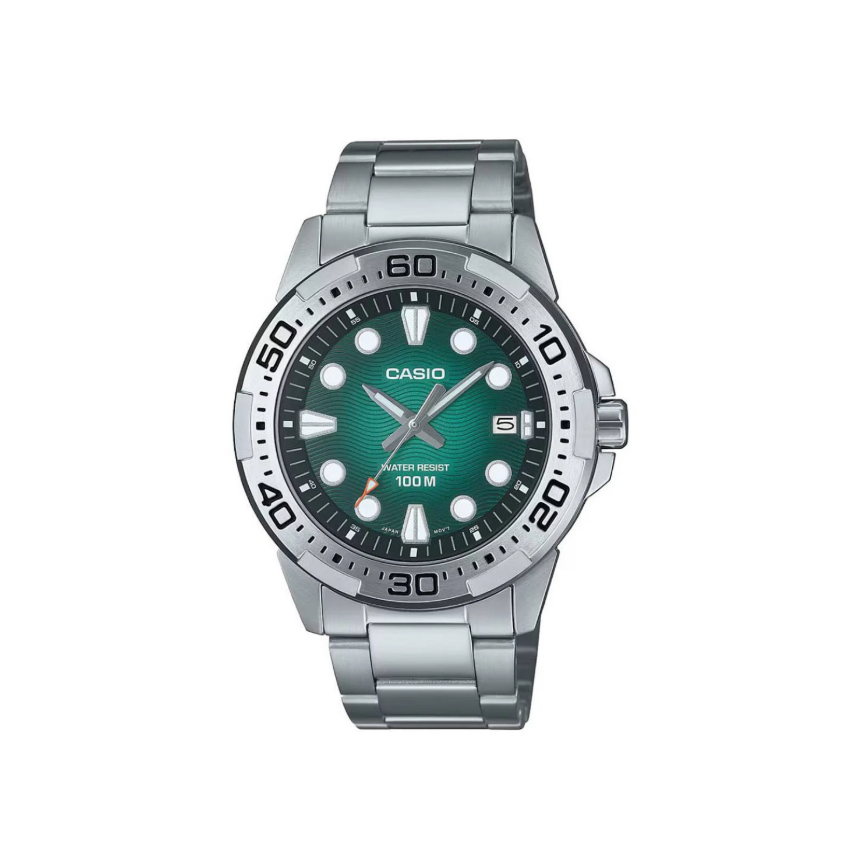 - Задвижван от надежден кварцов механизъм с точност ±20 секунди на месец и батерия с живот до 3 години (SR920SW), Casio Marine Sports предлага стандартно аналогово време с три стрелки и дискретен прозорец за дата върху интересен текстуриран дисплей в преливащо се зелено до черно.