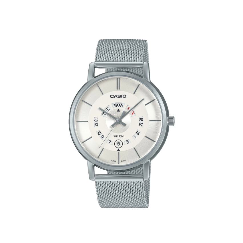 - Циферблатът веднага грабва окото с контрастно и ясно оформено поле за деня и датата върху светла основа.
