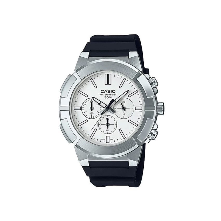 - Дисплеят е хронограф в бял цвят с черни детайли и показател за 24-часов формат.