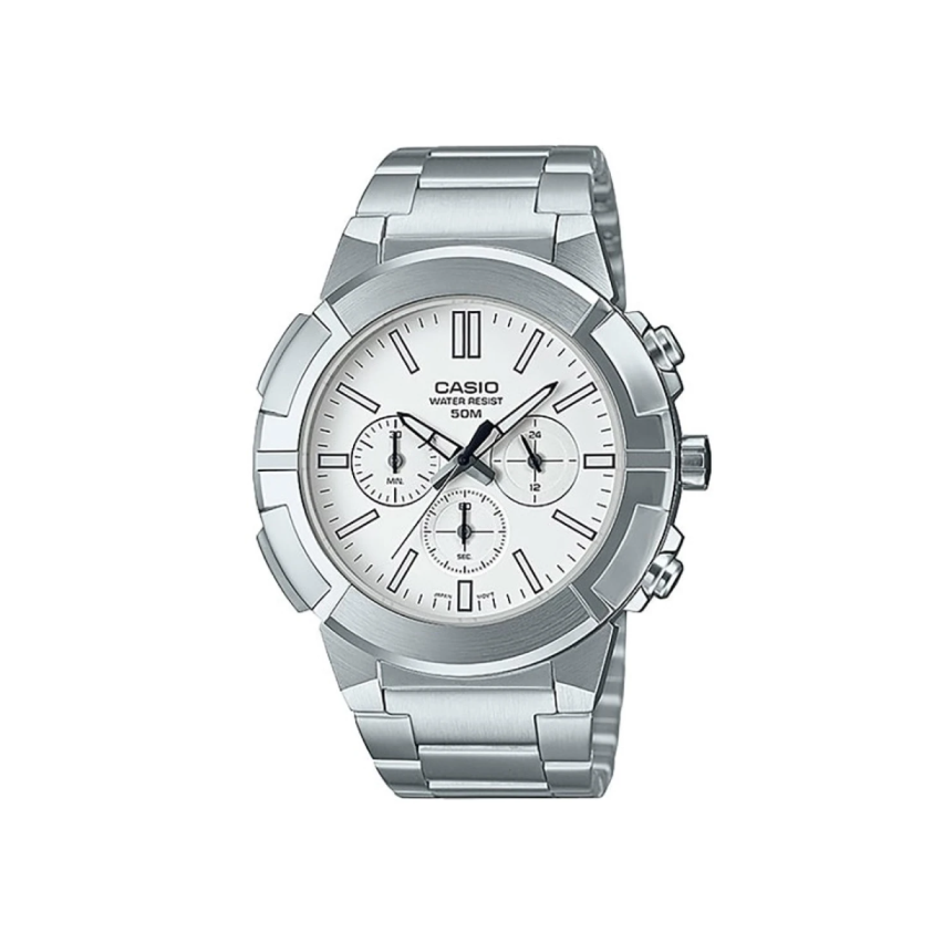 - Дисплеят е хронограф в бял цвят с черни детайли и показател за 24-часов формат.