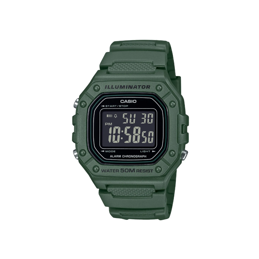 - Часовникът е изработен от полимер в зелен цвят за корпуса и каишката, има минерално стъкло, черен дигитален дисплей и множество допълнителни функции.