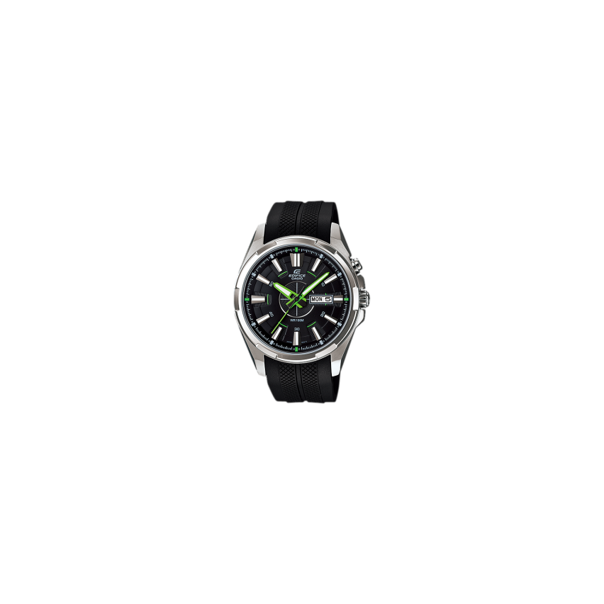 Casio EFR-102-1A3V е много добър модел от серията EdificeКорпусът е изработени изцяло от оксидирана черна стомана, а каишката от полимерен материал Casio EFR-102-1A3V е с черен циферблат и зелени обозначения, което го прави уникален ръчен часовник, с изискан и модерен дизайн Луминесцентно покритие, осигуряващо продължително осветяване на тъмно дори и след кратко излагане на светлина Той е аналогов и показва час, минути и секунди Часовника има минерално стъкло, устойчиво на надрасквания Притежава много практични функции - хронометър, показва датата и ден на дисплея и е водоустойчив на 10 bar Логото на часовника е щамповано на задния капак, короната и закопчалката Всичките му изброени функции и качества го правят много интересен и търсен.