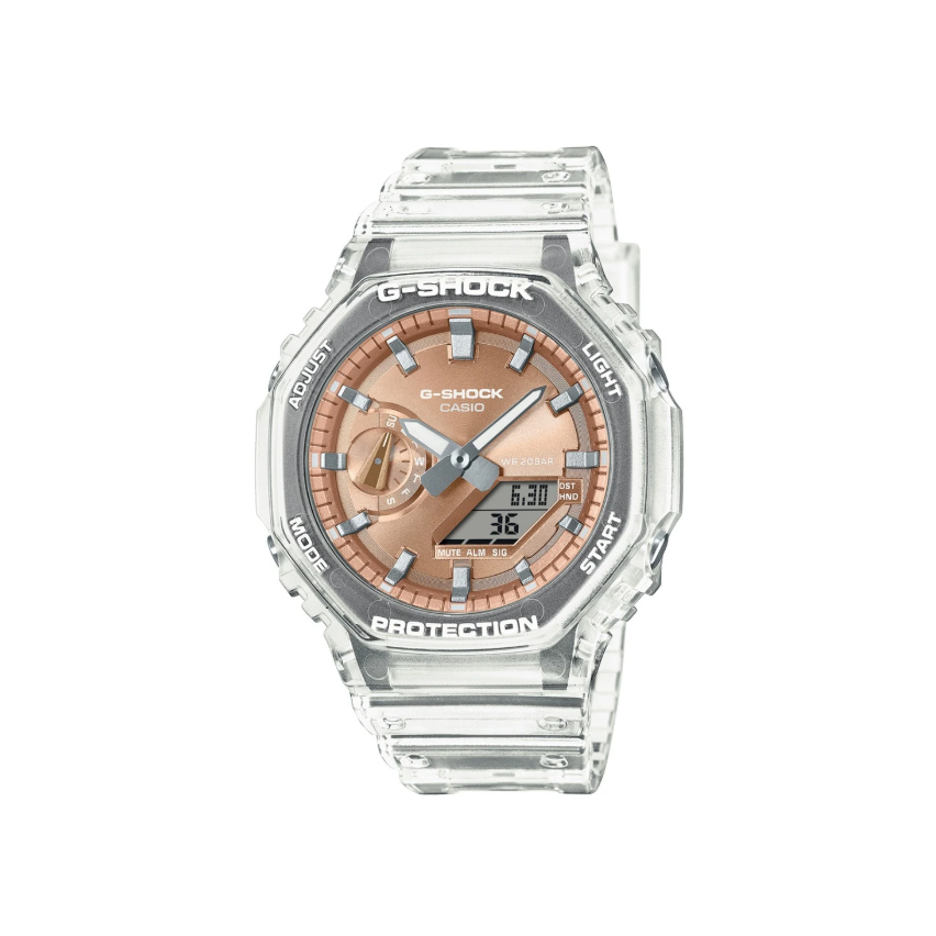 - Часовниците от серията G-Shock GA-2100 се отличават с емблематичния си осмоъгълен дизайн и иновативната Carbon Core Guard конструкция – символи на здравина, лекота и стил.
