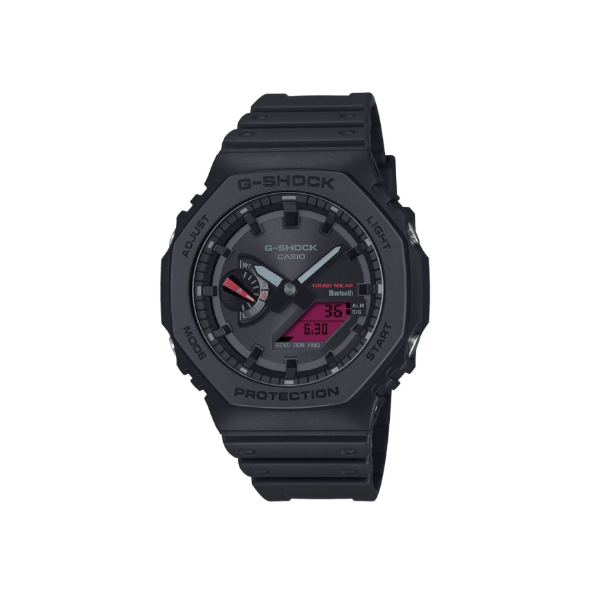 - Наситеното червено на LCD дисплея изпъква ярко върху черния корпус, каишка и циферблат, придавайки едновременно отлична видимост и силно визуално въздействие.