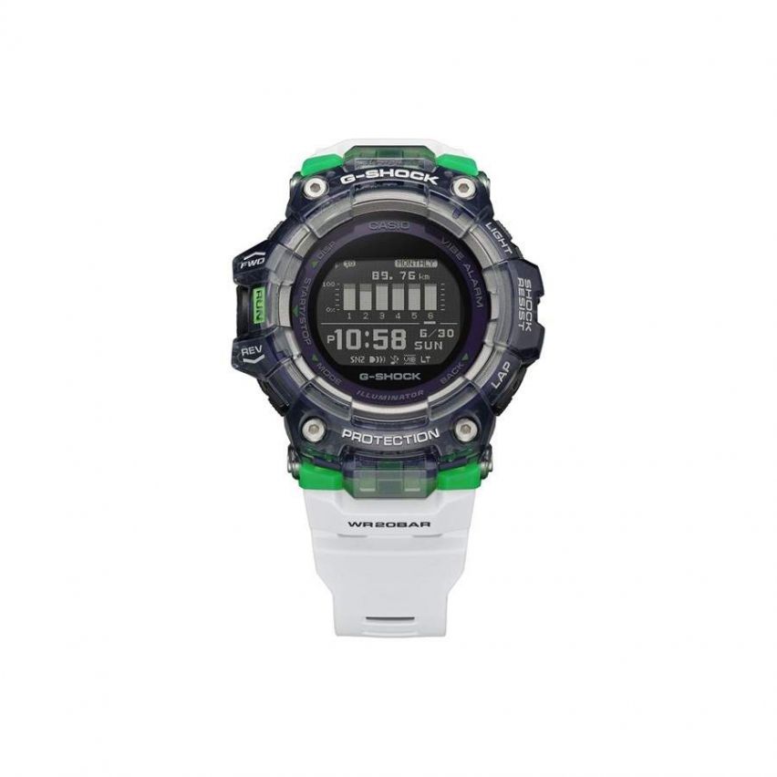 - Модел GBD-100SM-1A7ER е с черен корпус комбинация от полимер и алуминий, черен дигитален дисплей, бяла полимерна каишка и прозрачен тъмен безел със зелени акценти