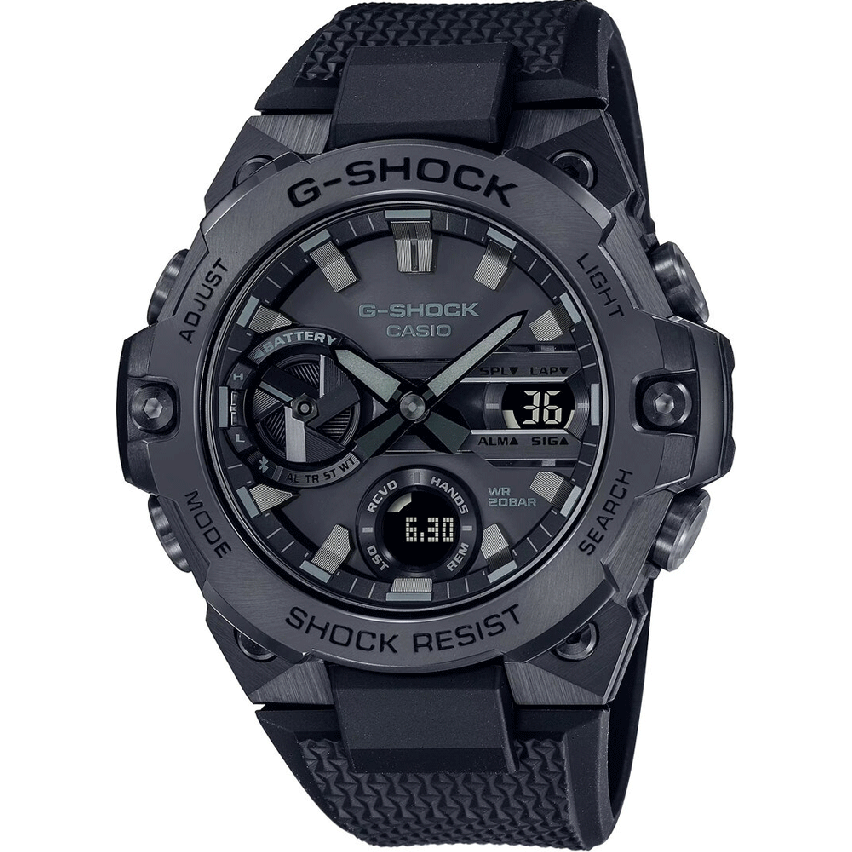 - Насладете се на еклектична изтънченост с G-STEEL смесването на метални и смолисти компоненти в популярния изцяло черен G-SHOCK.