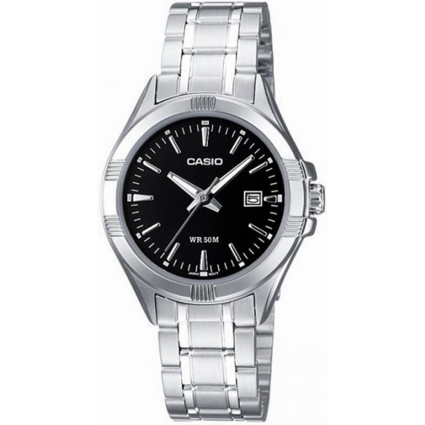 - Дамски часовник CASIO - LTP-1308D-1AV Производител: Casio Референтен номер: LTP-1308D-1A Подходящ за: Жени Гаранция: 2 години Колекция: Casio Collection Основен цвят: Сив Материал на корпус: Неръждаема стомана Диаметър на корпус (мм): 31 Стъкло: Най-разпространен тип стъкло, устойчиво на надраскване. Минерал-кристал Дисплей: Аналогов Цвят на дисплея: Черен Дата: Да Механизъм: Задвижва се от батерия. Кварц Водоустойчивост: Допускат се леки пръски и взимане на слаб душ. Не се препоръчва обилно мокрене. 5 ATM Материал на верижка/каишка: Неръждаема стомана Цвят на верижка/каишка: Сив