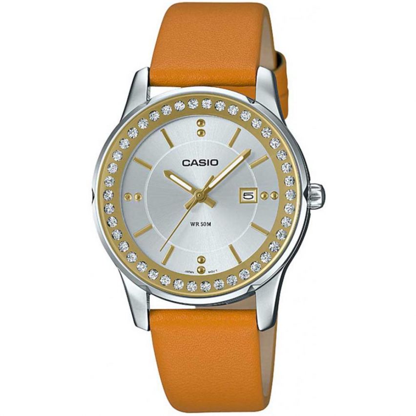 - Дамски часовник CASIO - LTP-1358L-7AV Производител: Casio Референтен номер: LTP-1358L-7AV Подходящ за: Жени Гаранция: 2 години Колекция: Casio Collection Материал на корпус: Метал Диаметър на корпус (мм): 32 Стъкло: Най-разпространен тип стъкло, устойчиво на надраскване. Минерал-кристал Дисплей: Аналогов Цвят на дисплея: Сребрист Дата: Да Механизъм: Задвижва се от батерия. Кварц Водоустойчивост: Допускат се леки пръски и взимане на слаб душ. Не се препоръчва обилно мокрене. 5 ATM Материал на верижка/каишка: Естествена кожа Цвят на верижка/каишка: Кафяв