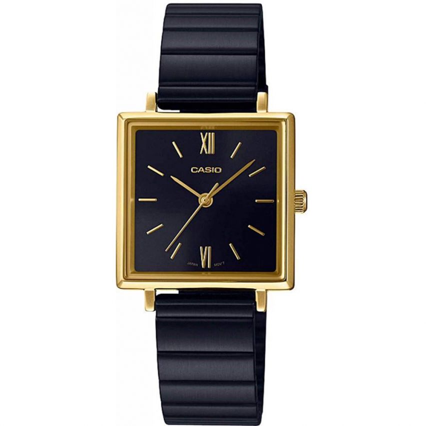 - Дамски часовник CASIO - LTP-E155GB-1A Производител: Casio Референтен номер: LTP-E155GB-1A Подходящ за: Жени Гаранция: 2 години Колекция: Casio Collection Материал на корпус: Неръждаема стомана Размери на корпус (мм): 25 х 31 Стъкло: Най-разпространен тип стъкло, устойчиво на надраскване. Минерал-кристал Дисплей: Аналогов Цвят на дисплея: Черен Механизъм: Задвижва се от батерия. Кварц Покритие (цвят): Злато Водоустойчивост: Допускат се леки пръски, препоръчително е да не се мокри. 3 ATM Материал на верижка/каишка: Неръждаема стомана Цвят на верижка/каишка: Черен
