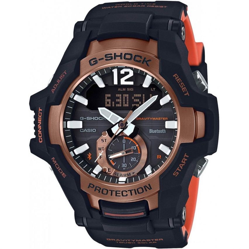 - Bluetooth G G-RESIST Аларма многофункционална Водоустойчивост 20 bar Дата с ден от семицата Минерално стъкло Осветление Електролуминисцентно Полимерна Световно време Соларна Батерия Хронометър с времена в паметта Хронометър с обратно броене