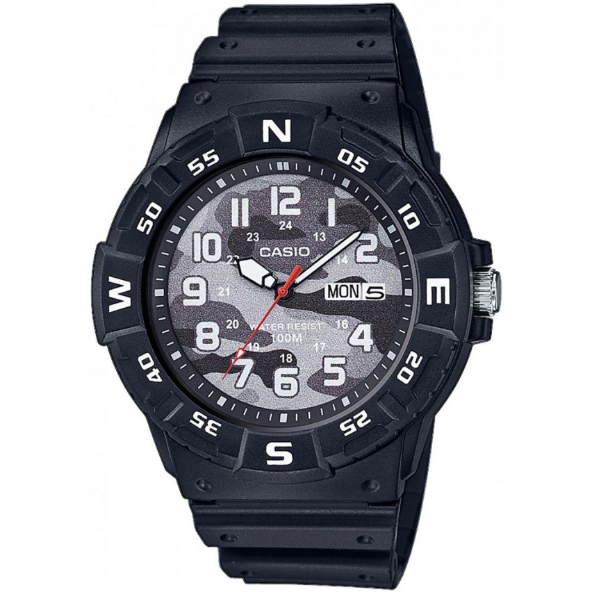 - Камуфлажен циферблат с бели арабски цифри, индекси и стрелки.