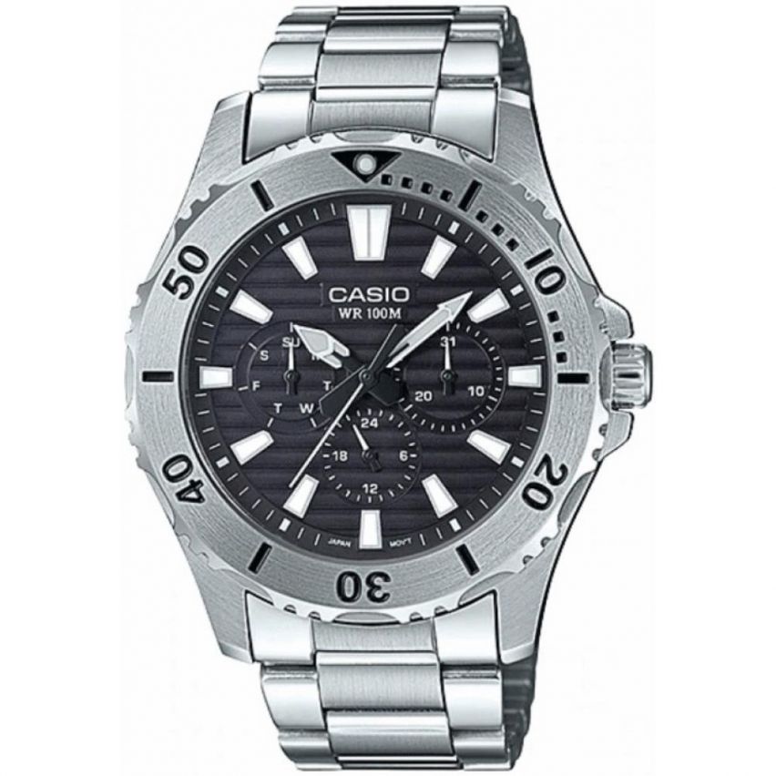 - Мъжки часовник CASIO - MTD-1086D-1AV Производител: Casio Референтен номер: MTD-1086D-1AV Подходящ за: Мъже Гаранция: 2 години Колекция: Casio Collection Материал на корпус: Неръждаема стомана Диаметър на корпус (мм): 45 Стъкло: Най-разпространен тип стъкло, устойчиво на надраскване. Минерал-кристал Дисплей: Мултифункционален Цвят на дисплея: Черен Дата: Да Механизъм: Задвижва се от батерия. Кварц Водоустойчивост: Позволява мокрене и плуване във водни басейни, без гмуркане. 10 ATM Материал на верижка/каишка: Неръждаема стомана Цвят на верижка/каишка: Сребрист