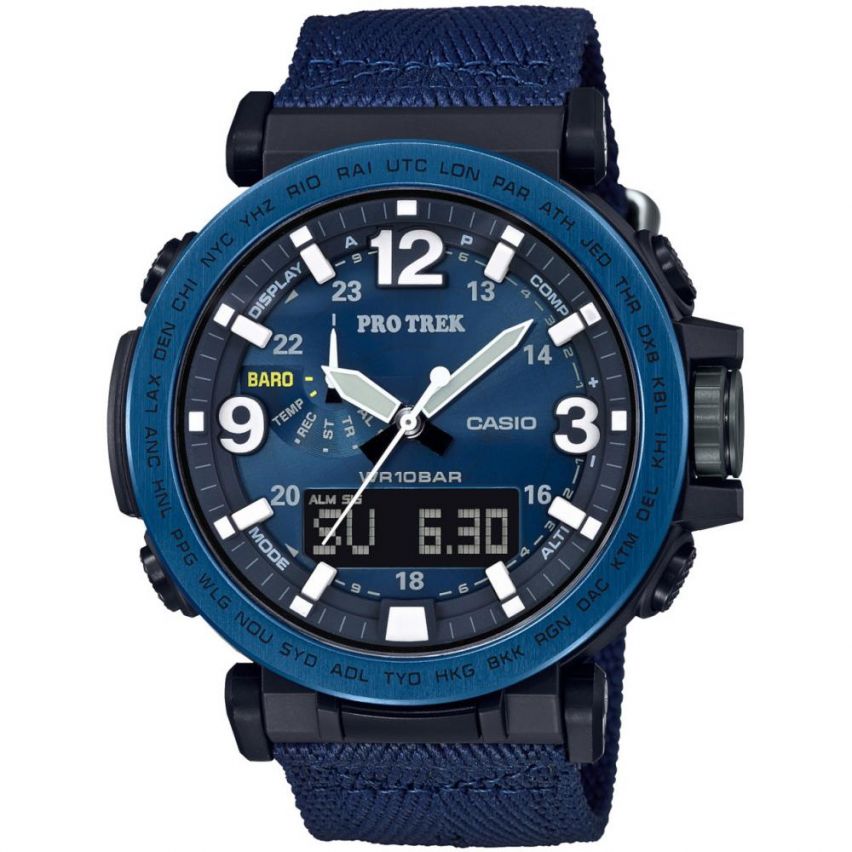 - Мъжки часовник CASIO PRO TREK - PRG-600YB-2ER Каишка от текстил Корпус от полимерен материал Минерално стъкло устойчиво към надраскване Соларна батерия захранвана от слънцето Индикатор показващ нивото на батерията Компас Алтиметър -700 до 10000m Барометър 260 до 1100 hPa Термометър -10 до 60°C Сумиране на височините - сумира всички височини на които сте изкачвали в сесия, така можете да видите общо колко метра сте изкачили Световно време Автоматичен календар Хронометър Обратно броене 12/24-часов формат 5 независими дневни аларми (и 1 с snooze функция) Електролуминисцентно осветлениe на целият дисплеи Водоустойчивост 10 бара - Позволява къпане, плуване и гмуркане (до 5 метра) Батерия CTL1616 Размер 51.6mm x 51.5mm x 13.4mm Тегло 67g